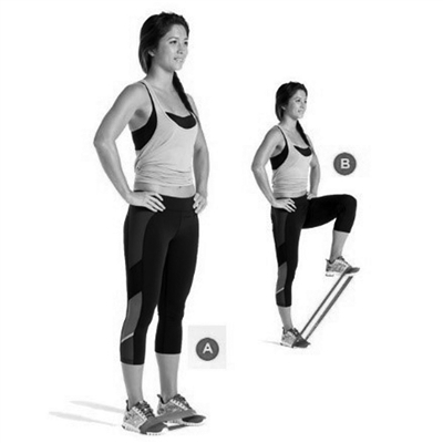 训练要求:站姿,保持身体直立;弹力环套在双脚前脚掌位置,右脚踩紧弹力环,左脚勾紧,屈髋向上,大腿抬至水平位即可,膝关节约90度;下落时脚不着地,再迅速抬起,单侧重复10-15次,两侧交替,2-4组即可。具备一定基础后,可配合摆臂进行抬腿,更具专项性的练习手段。