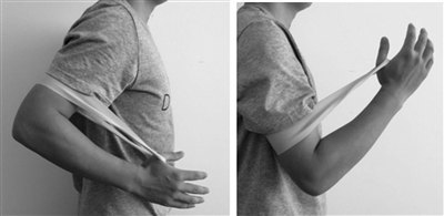 训练要求:选择轻阻力弹力环,一端套在肘关节稍上位置,另一端套在虎口,五指自然松开;可在日常跑步前的准备活动中进行该方法,强化摆臂的感觉。
