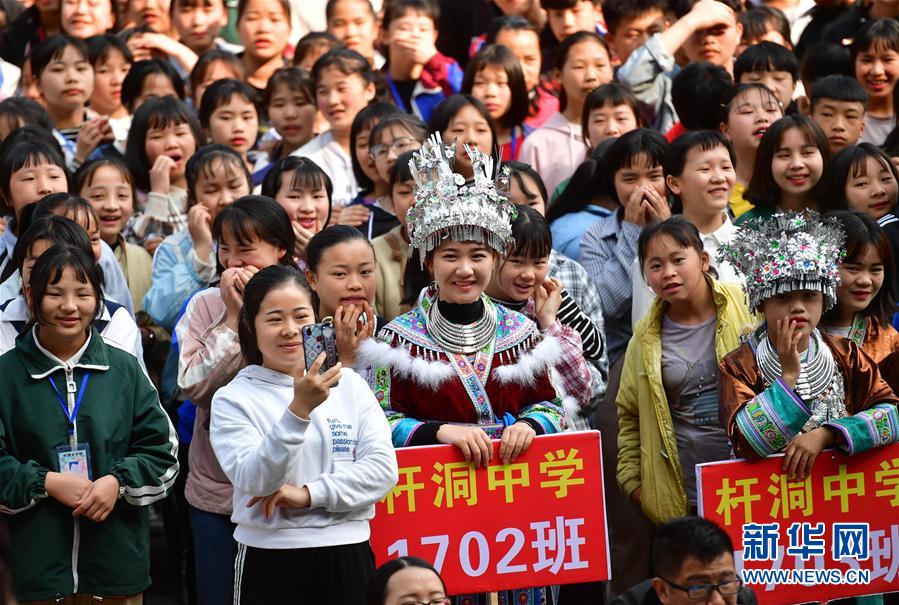 4月17日,同学们观看运动会开幕式文艺表演。 当日,广西融水苗族自治县杆洞中学举办春季运动会。本次运动会设有接力跑、跳绳、长跑等多个比赛项目,让同学们在春光中享受运动的快乐。 新华社记者黄孝邦摄