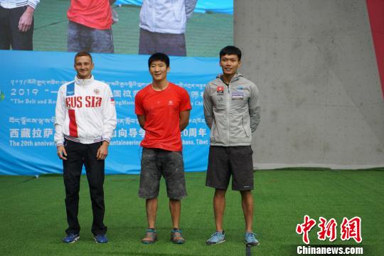 图为10日,中国香港运动员游嘉俊(右一)获得拉萨国际攀岩大师赛男子难度赛的季军。 张伟 摄