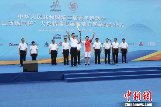 山西省政协副主席、吕梁市委书记李正印宣布“中华人民共和国第二届青年运动会‘山西燃气杯’火炬传递吕梁站传递开始”。吕梁市委副书记、市长王立伟点燃第一棒火炬,并交给第一棒火炬手、第十一届亚运会女子举重冠军郭秋香。