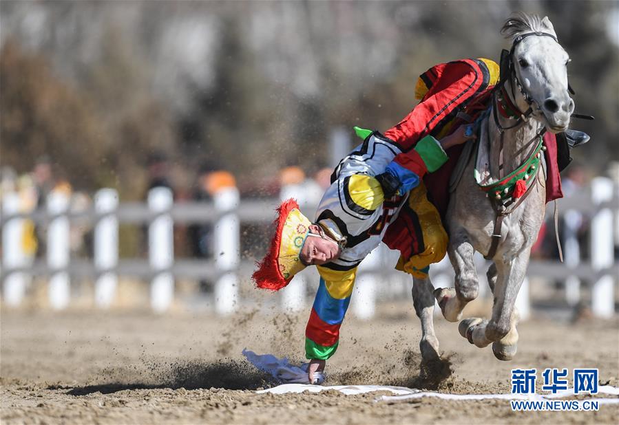图为2019年2月7日,藏历新年初三,骑手在拉萨北郊赛马场进行马术表演。新华社记者普布扎西摄