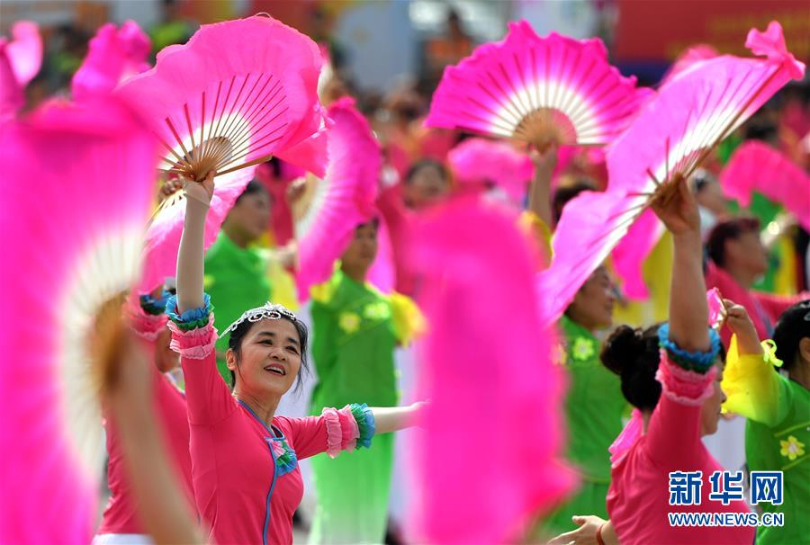 8月8日,市民在2019年河南省分会场表演健身秧歌。 当日,2019年全国“全民健身日”活动河南省分会场暨郑州市全民健身日群体展演活动在河南省郑州市郑东新区如意湖广场举行。本次活动以“健康中国·你我同行”为主题,展示了广播体操、健身秧歌、瑜伽等全民健身项目。 新华社记者李嘉南摄