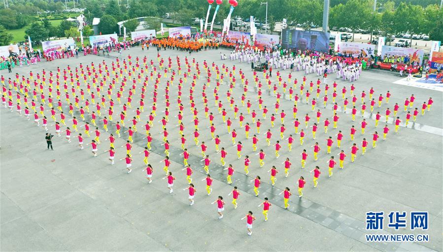 8月8日,市民在河南省分会场表演健身操(无人机拍摄)。 当日,2019年全国“全民健身日”活动河南省分会场暨郑州市全民健身日群体展演活动在河南省郑州市郑东新区如意湖广场举行。本次活动以“健康中国·你我同行”为主题,展示了广播体操、健身秧歌、瑜伽等全民健身项目。 新华社记者李嘉南摄