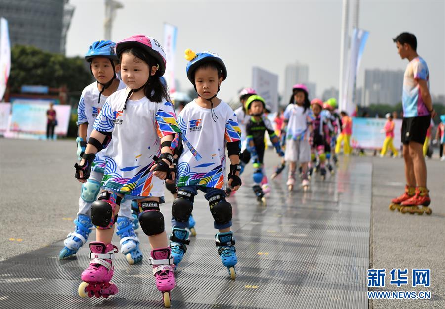 8月8日,小朋友们在河南省分会场练习轮滑。 当日,2019年全国“全民健身日”活动河南省分会场暨郑州市全民健身日群体展演活动在河南省郑州市郑东新区如意湖广场举行。本次活动以“健康中国·你我同行”为主题,展示了广播体操、健身秧歌、瑜伽等全民健身项目。 新华社记者李嘉南摄