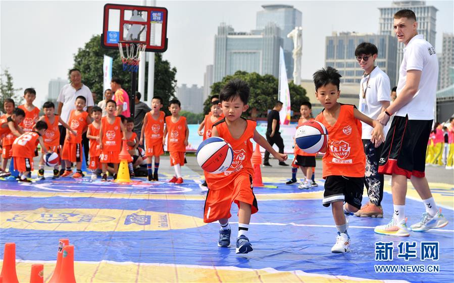8月8日,小朋友们在河南省分会场练习篮球运球。 当日,2019年全国“全民健身日”活动河南省分会场暨郑州市全民健身日群体展演活动在河南省郑州市郑东新区如意湖广场举行。本次活动以“健康中国·你我同行”为主题,展示了广播体操、健身秧歌、瑜伽等全民健身项目。 新华社记者李嘉南摄