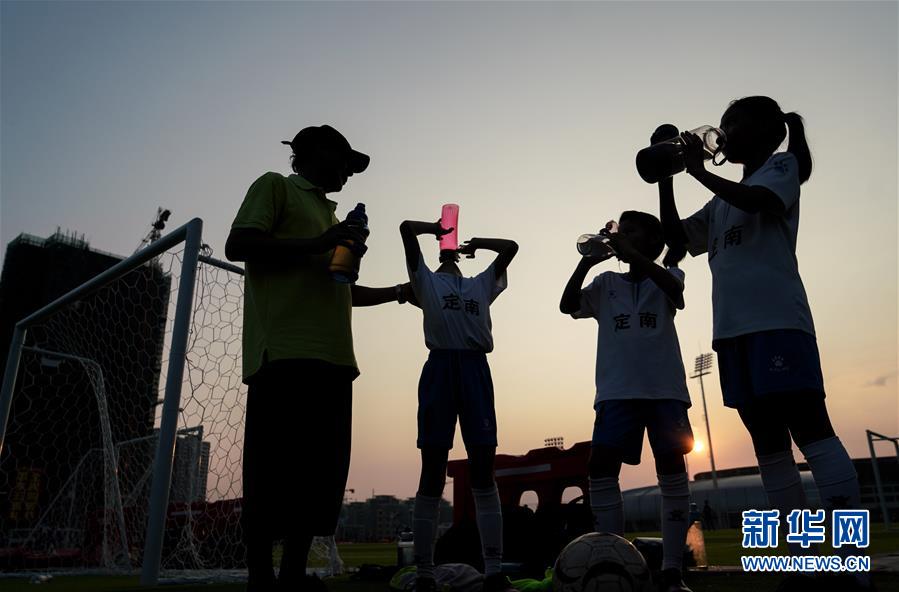 章恊如(左)在训练间隙和学生一起喝水休息(2019年9月17日摄)。 新华社记者胡晨欢摄