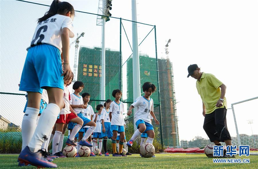 章恊如(右)在指导学生如何进行盘带(2019年9月17日摄)。 新华社记者胡晨欢摄