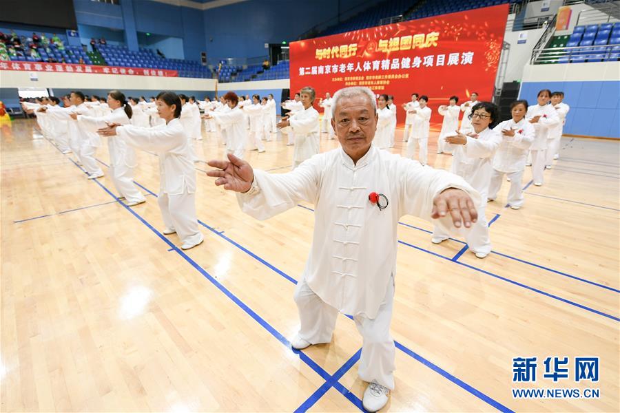 10月23日,南京市秦淮区老年人体育协会的老人们正在表演太极拳节目“大美秦淮”。 当日,第二届南京市老年人体育精品健身项目展演在南京市龙江体育馆举行,本次展演由南京市各区选送,共有广场舞、空竹、木兰扇、八段锦等17个节目,展现了老年人体育项目普及与推广的成果。 新华社记者 李博 摄