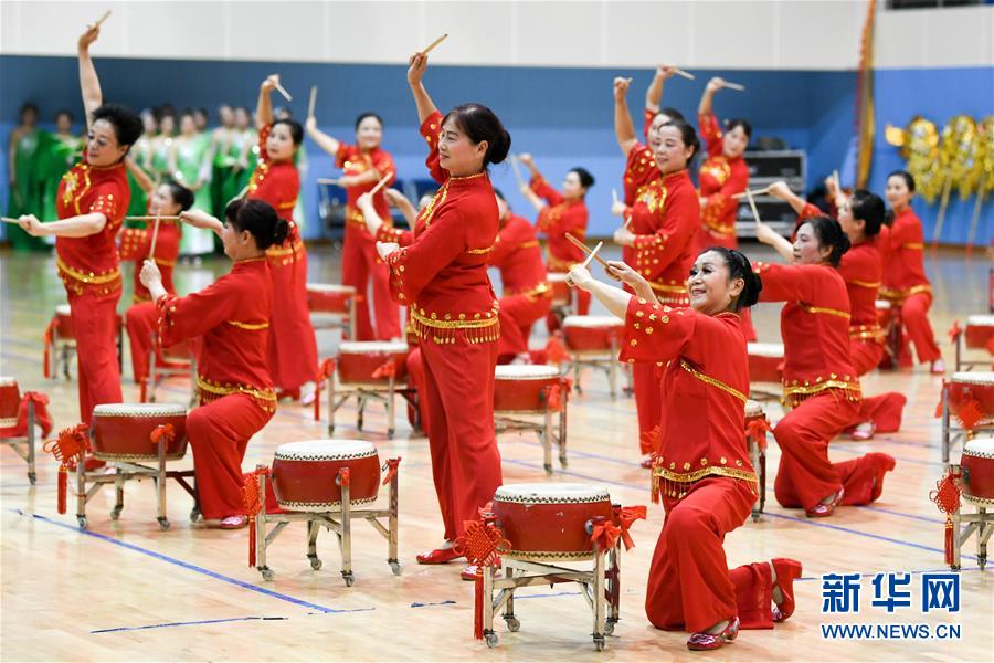 10月23日,南京市溧水区老年人体育协会的老年人朋友正在表演鼓·舞节目“盛世欢鼓”。 当日,第二届南京市老年人体育精品健身项目展演在南京市龙江体育馆举行,本次展演由南京市各区选送,共有广场舞、空竹、木兰扇、八段锦等17个节目,展现了老年人体育项目普及与推广的成果。 新华社记者 李博 摄