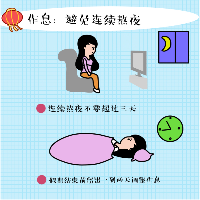 连续三天以上的长期熬夜会导致整个机体的紊乱,给身体造成惯性疲劳、精神不振、免疫力下降等损伤,不只是体型,对人的身体健康也有很大影响。所以在假期“放肆玩耍”之余,最好能在假期结束前留出一到两天时间恢复正常作息。