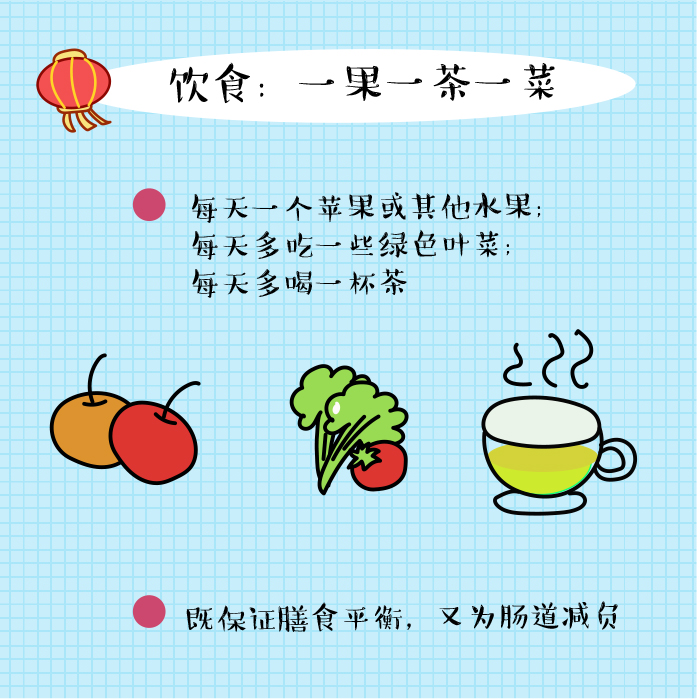 再简单一点说,就是保证“一果一茶一菜”原则,即:每天一个苹果或其他水果;每天多吃一些绿色叶菜;每天多喝一杯茶。如此,既保证膳食平衡,又为肠道减负。
