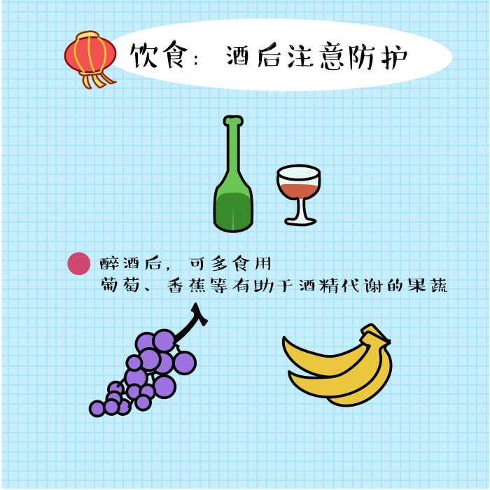 另外,还有一部分人免不了“酒海浮沉”。在推杯换盏之余,更要做好防护。醉酒后,可多食用葡萄、香蕉等有助于酒精代谢的果蔬,以降低血液中的酒精浓度,尽快解酒。