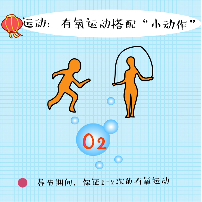 说一千道一万,对抗热量过剩最有效的方法,还是动起来。春节假期,你可以稍微放松一下,不必天天泡在健身房里,但是至少一次的有氧运动和一些“小动作”,是你需要坚持的。