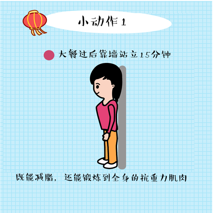 除了有氧运动,间歇性做一些不受场地限制、随时都可进行的健身“小动作”很有必要:大餐过后靠墙站立15分钟,既能减脂,还能锻炼到全身的抗重力肌肉。