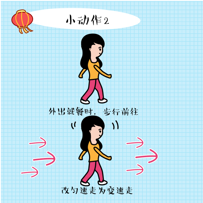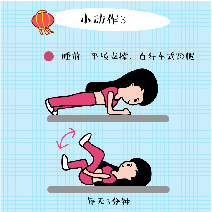 而外出就餐时,大可步行前往,同时将匀速走改为变速走,一举多得,既能抵达美食战场,也能锻炼身体;平板支撑、自行车式蹬腿都是睡前可以进行的小运动,每天三分钟,也可帮你消耗热量。