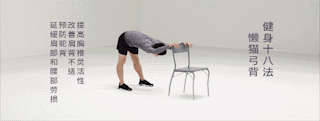 懒猫弓背,该动作可以提高胸椎灵活性。改善肩背不适,防止驼背,预防和延缓肩部和腰部劳损。其动作要领是:手扶椅背弓弓背,拉抻脊柱背不累,像只猫咪伸懒腰,肩背放松不疲惫。