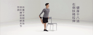 站姿拉伸,该动作可以改善下背部紧张,预防腰部和膝关节劳损。其动作要领是:坐在稳定椅子上,双手交叉顶内膝。大腿向里手抵抗,身体前倾不能忘。