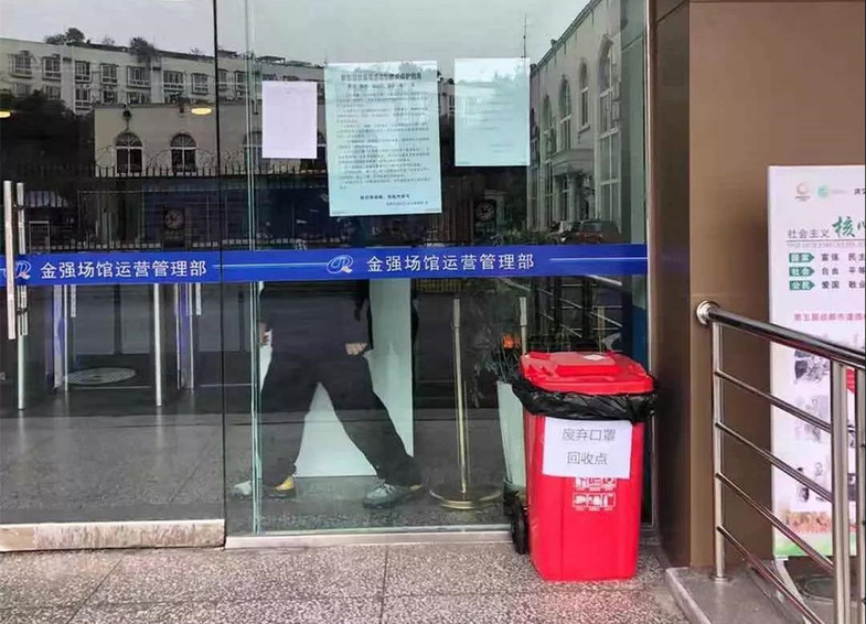 体育馆门前的废弃口罩回收桶。成都市体育局供图