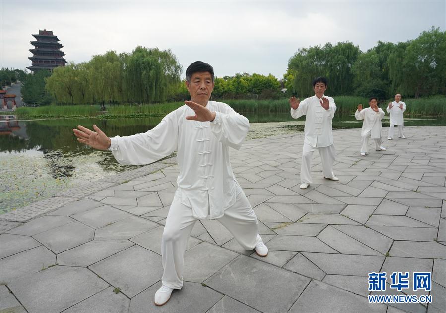 6月18日,太极拳爱好者在迁安市黄太湖边练习太极拳。 6月初夏,河北省迁安市黄太湖边绿树成荫,环境优美,每天早上都有许多市民来这里晨练健身。 新华社记者 杨世尧 摄