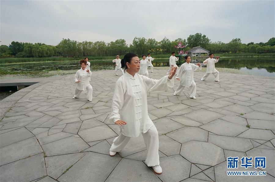 6月18日,太极拳爱好者在迁安市黄太湖边练习太极拳。 6月初夏,河北省迁安市黄太湖边绿树成荫,环境优美,每天早上都有许多市民来这里晨练健身。 新华社记者 杨世尧 摄