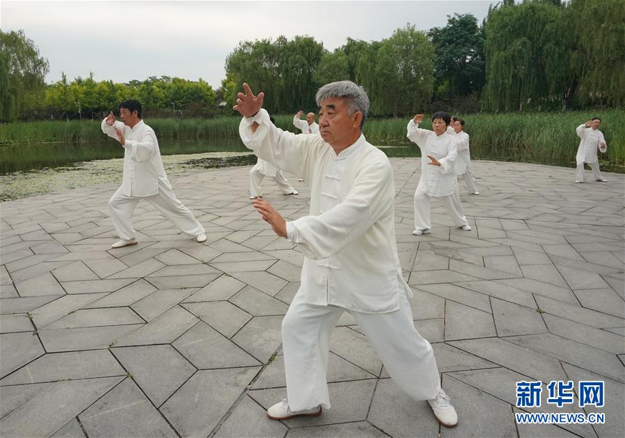 6月18日,太极拳爱好者在迁安市黄太湖边练习太极拳。6月初夏,河北省迁安市黄太湖边绿树成荫,环境优美,每天早上都有许多市民来这里晨练健身。 新华社记者 杨世尧 摄