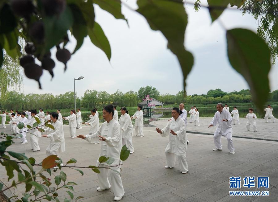 6月18日,太极拳爱好者在迁安市黄太湖边练习太极拳。6月初夏,河北省迁安市黄太湖边绿树成荫,环境优美,每天早上都有许多市民来这里晨练健身。 新华社记者 杨世尧 摄
