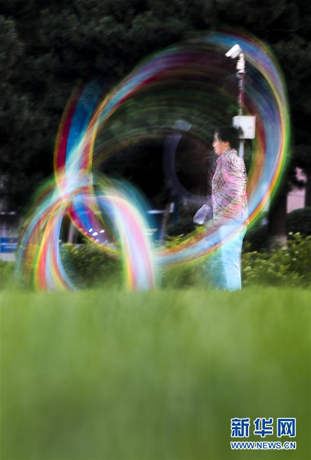 8月5日,市民进行健身彩绸舞。 入夏以来,每当傍晚时分,许多爱好健身彩绸舞的市民都会来到长春市文化广场舞动彩绸、运动健身。伴着清凉晚风,飞舞的彩绸形成一道美丽的风景。 新华社记者许畅摄
