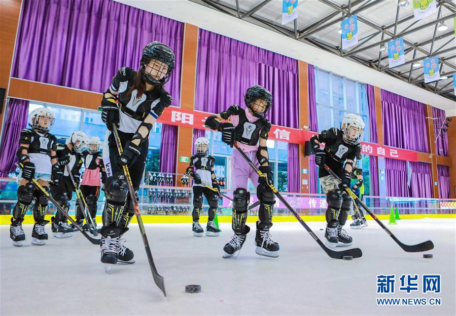 8月5日,美的小学冰球队队员在进行热身训练。 正值暑期,河北省邯郸市邯山区美的小学冰球队在室内仿真冰场展开集中训练,在“冰场”上享受假期生活。2020年5月,河北省邯郸市邯山区建成一个500平方米的室内仿真冰场,冰场配建24米冰壶场地1块,配备冰球、滑冰装备100套,为当地喜欢冰上运动的青少年提供了方便。 新华社记者 王晓 摄