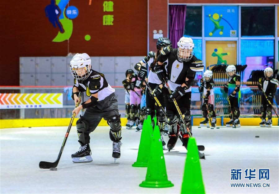8月5日,冰球队的队员在仿真冰场热身训练。 正值暑期,河北省邯郸市邯山区美的小学冰球队在室内仿真冰场展开集中训练,在“冰场”上享受假期生活。2020年5月,河北省邯郸市邯山区建成一个500平方米的室内仿真冰场,冰场配建24米冰壶场地1块,配备冰球、滑冰装备100套,为当地喜欢冰上运动的青少年提供了方便。 新华社记者 王晓 摄