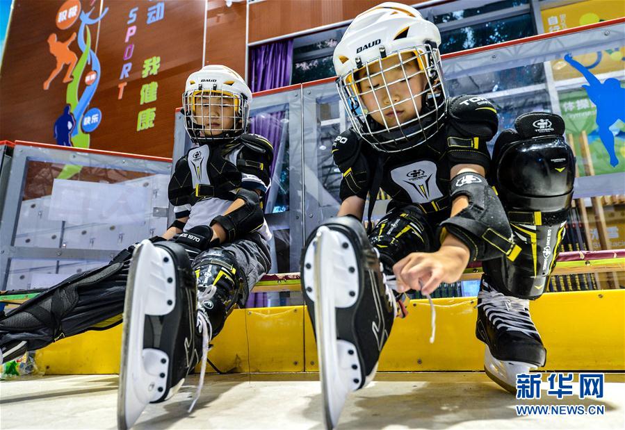 8月5日,冰球队队员在穿冰球鞋。 正值暑期,河北省邯郸市邯山区美的小学冰球队在室内仿真冰场展开集中训练,在“冰场”上享受假期生活。2020年5月,河北省邯郸市邯山区建成一个500平方米的室内仿真冰场,冰场配建24米冰壶场地1块,配备冰球、滑冰装备100套,为当地喜欢冰上运动的青少年提供了方便。 新华社记者 王晓 摄