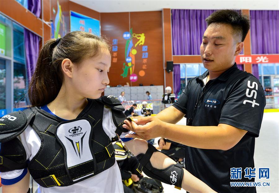 8月5日,美的小学冰球队队员郭丁旖(左)在教练王龙的帮助下穿着护具。 正值暑期,河北省邯郸市邯山区美的小学冰球队在室内仿真冰场展开集中训练,在“冰场”上享受假期生活。2020年5月,河北省邯郸市邯山区建成一个500平方米的室内仿真冰场,冰场配建24米冰壶场地1块,配备冰球、滑冰装备100套,为当地喜欢冰上运动的青少年提供了方便。 新华社记者 王晓 摄