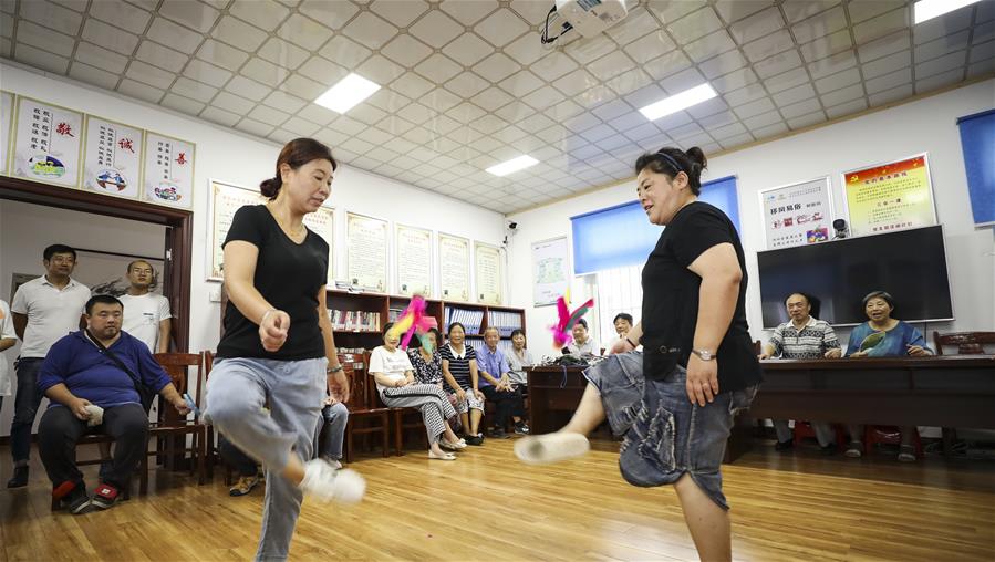 8月7日,在淮安市淮安区淮城街道瞻岱社区,居民们在趣味运动赛中进行踢毽子比赛 。 当日,江苏省淮安市举行“全民健身日”系列活动,活动包括全民健步走、科学健身大讲堂、国民体质监测服务、科学健身知识宣传、全民健身大评选等内容。主办方希望通过活动,推广普及合理运动、科学健身的理念,同时也让“全民健身、全民健康、全民共享”的群众体育理念更加深入人心。 新华社发(赵启瑞 摄)