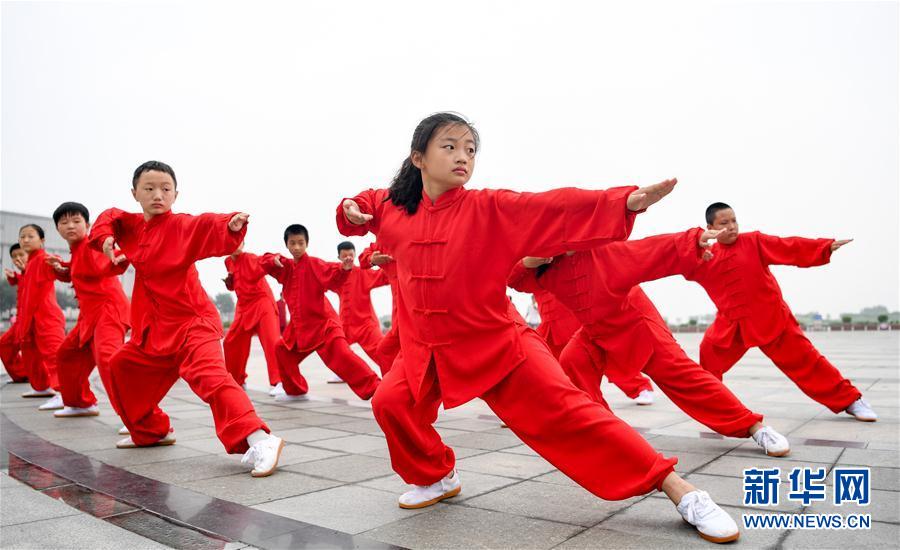 8月12日,学员们在衡水市冀州区九州文化广场练习三皇炮捶拳术。 暑假期间,河北省衡水市三皇炮捶传承人赵恒通开办武术健身班,义务传授被列入河北省级非物质文化遗产名录的三皇炮捶,吸引百余名青少年前来学习。 新华社记者 朱旭东 摄