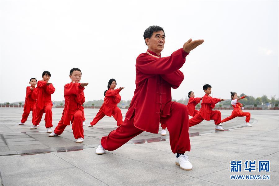 8月12日,三皇炮捶传承人赵恒通(前)带领小学员们练习三皇炮捶拳术。 暑假期间,河北省衡水市三皇炮捶传承人赵恒通开办武术健身班,义务传授被列入河北省级非物质文化遗产名录的三皇炮捶,吸引百余名青少年前来学习。 新华社记者 朱旭东 摄