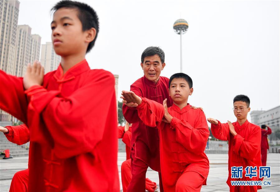 8月12日,三皇炮捶传承人赵恒通(左二)指导小学员练习三皇炮捶拳术。 暑假期间,河北省衡水市三皇炮捶传承人赵恒通开办武术健身班,义务传授被列入河北省级非物质文化遗产名录的三皇炮捶,吸引百余名青少年前来学习。 新华社记者 朱旭东 摄