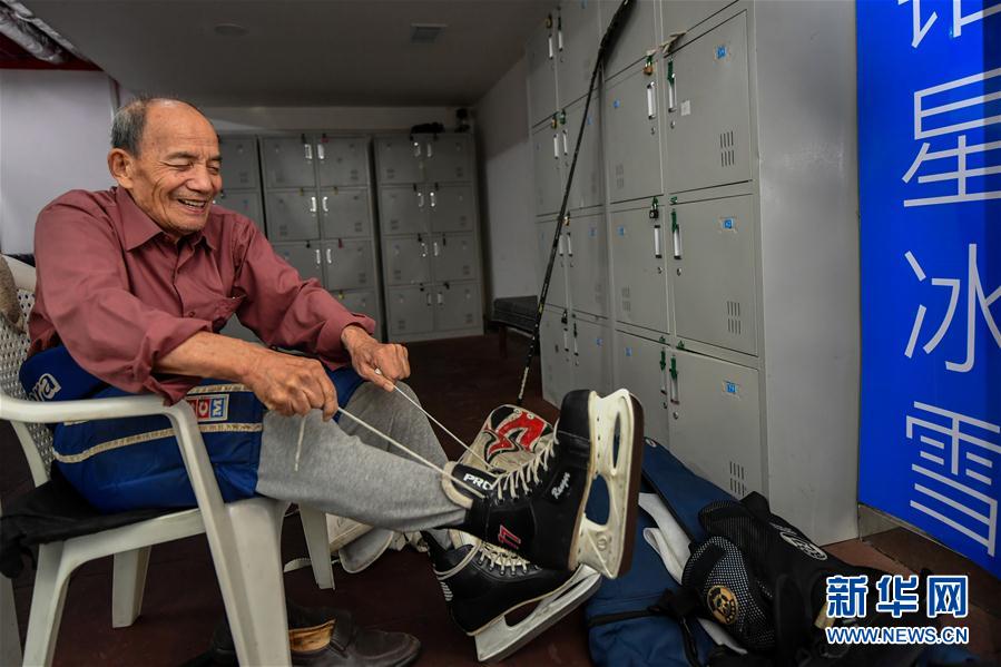 今年85岁的武之乃是山西太原人,自小就接触冰雪运动的他,“冰龄”接近80年,冰球早已成为了他生活中不可或缺的一部分。 1957年,武之乃从山西大学体育系毕业,到太原市第十二中学从事体育教学。为了培养学生们的兴趣爱好,武之乃开设了滑冰课程。他还赴各地接受专业滑冰培训,积极推广冰上运动。 1999年,早已退休的武之乃联合一些球友共同成立了太原北极熊冰球队,并担任领队至今。北极熊冰球队现有成员30余人,平均年龄近50岁。随着年龄的不断增长,武之乃在球场上的位置从后卫变成了守门员。但他说,不变的是他对冰雪运动的热爱。 为了迎接2022年冬奥会,武之乃正在整理自己收藏的山西冰雪运动资料,打算捐给山西体育博物馆。“希望更多的年轻人参与到冰雪运动中来,为全国冰上运动发展贡献自己的力量”,武之乃说。 这是武之乃在更衣室穿戴打冰球的装备(2020年8月6日摄)。 新华社记者 曹阳 摄