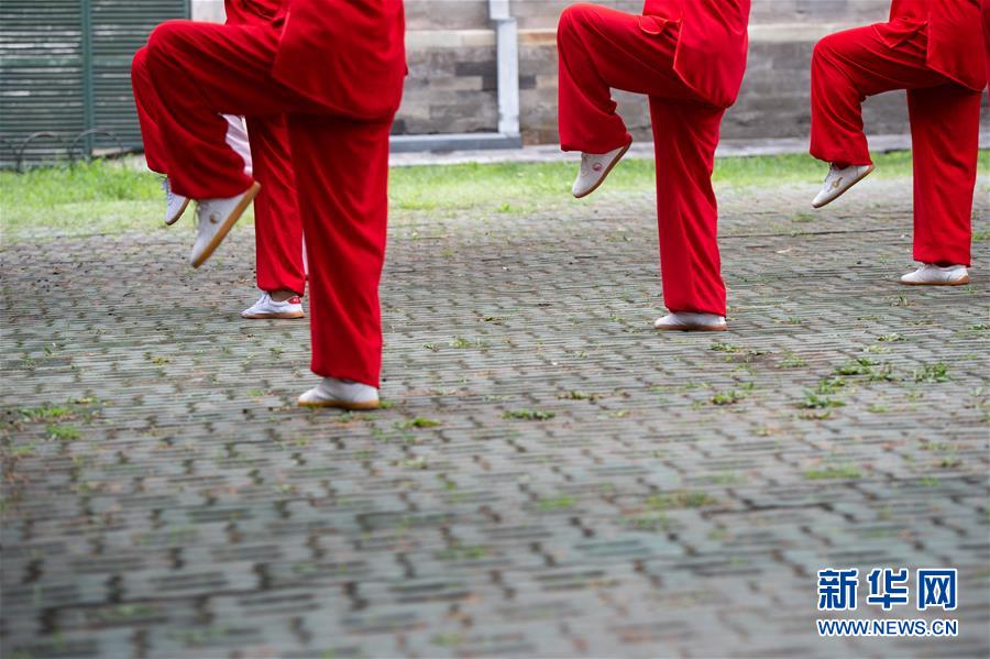 学员在北京天坛公园练习太极剑动作(8月19日摄)。 新华社记者孟涛摄