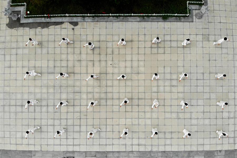 8月23日,健身爱好者练习太极拳(无人机照片)。 当日,许多太极拳、太极功夫扇爱好者来到河北省新河县南湖公园进行练习、表演,强身健体。 新华社记者牟宇摄