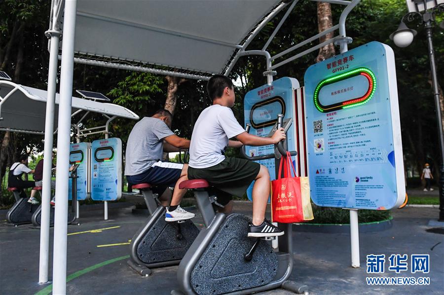 8月14日,市民在深圳市中心公园使用智能竞赛车锻炼。 在广东深圳核心区域的中心公园里,有一座占地面积约800平方米的“智能健身房”,自2019年底面向公众开放以来,每天吸引上千人次前来锻炼。整个室外“智能健身房”按照功能区分,包括体质测试区、心肺功能和力量训练区、智能竞赛区、热身和放松区等六个区域,不同区域满足不同功能的训练和测试。来锻炼的市民扫描设备上的二维码,可通过小程序获取运动数据。市民在运动时也可随时观察到消耗热量等即时数据。 新华社记者毛思倩摄