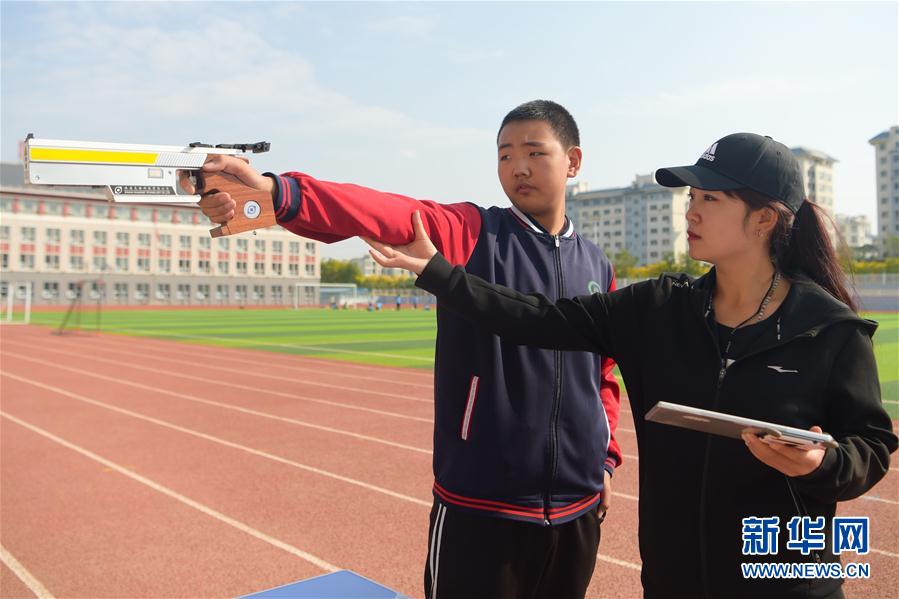 9月21日,体育老师全荣(右)在射击课上指导学生。 握枪、瞄准、射击……在内蒙古自治区乌海市第九中学,学生们在激光枪射击课堂上练习射击技能。乌海市第九中学2018年以来丰富课程设置,开设了激光枪射击等体育兴趣课,加强学生体育锻炼,促进学生综合发展。 新华社记者 李志鹏 摄