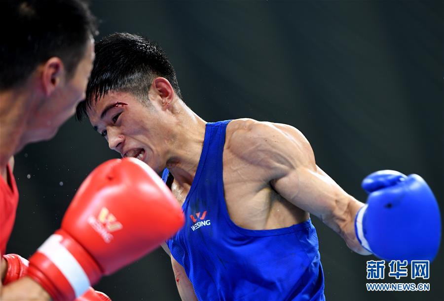 9月21日,来自贵州的选手张果和重庆队选手高灿(右)在52公斤级半决赛中。 当日,在河南省洛阳市宜阳县举行的2020年全国男子拳击锦标赛52公斤级半决赛中,来自贵州的选手张果以3比2击败重庆队选手高灿,晋级决赛。 新华社记者 李安 摄