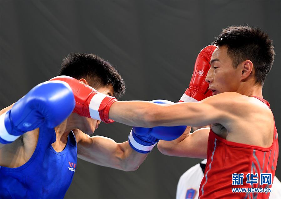 9月21日,来自贵州的选手张果(右)和重庆队选手高灿在52公斤级半决赛中。 当日,在河南省洛阳市宜阳县举行的2020年全国男子拳击锦标赛52公斤级半决赛中,来自贵州的选手张果以3比2击败重庆队选手高灿,晋级决赛。 新华社记者 李安 摄
