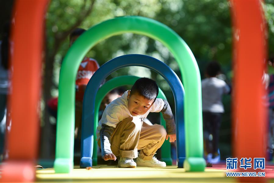 10月9日,在江苏省南京市,幼儿园小朋友在进行“钻山洞”项目。 中秋国庆长假过后,江苏省南京市一家幼儿园为返校的小朋友们举办了丰富多彩的体育活动,希望孩子们通过这些趣味活动锻炼协调和平衡能力,养成喜爱户外运动的良好习惯。 新华社发(方东旭 摄)