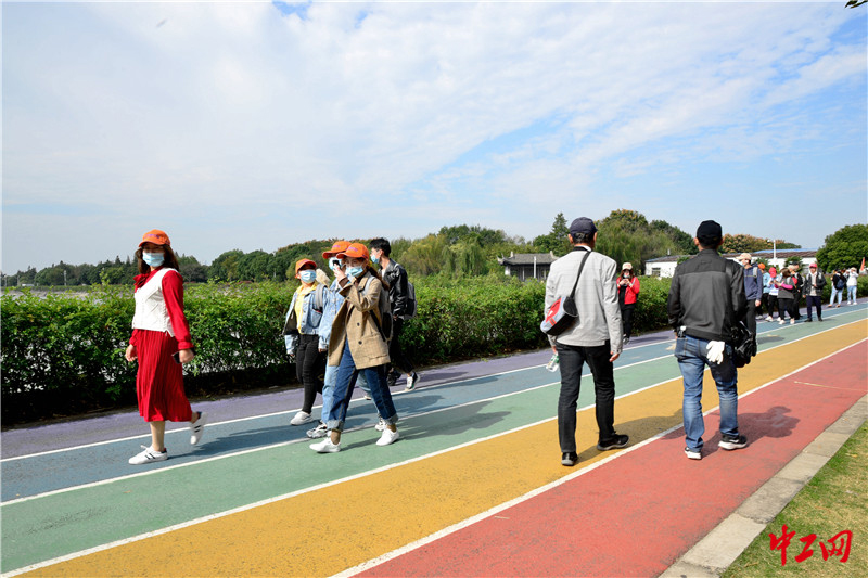 2020年10月25日,无锡市太湖湖畔贡湖湾五彩赛道上,市民们迎接马拉松赛,感受一把跑道,欣赏一次太湖秋日风光。杨木军摄