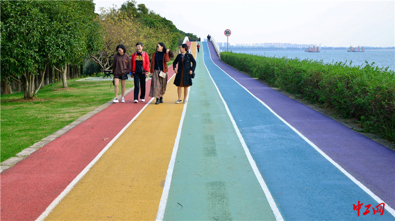 2020年10月25日,无锡市太湖湖畔贡湖湾五彩赛道上,市民们借马拉松赛助跑之机欣赏太湖秋日风光。杨木军摄