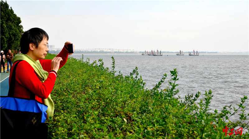 2020年10月25日,无锡市太湖湖畔贡湖湾五彩赛道上,一位市民借马拉松赛助跑之机拍摄太湖秋日风光。杨木军摄