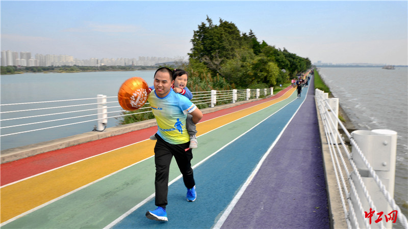 2020年10月25日,无锡市太湖湖畔贡湖湾五彩赛道上,一位跑步爱好者驮着女儿迎接马拉松赛。杨木军摄