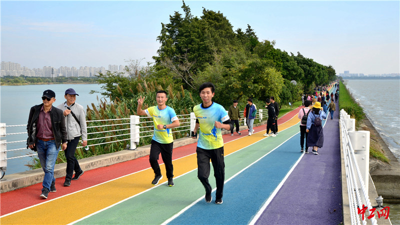 2020年10月25日,无锡市太湖湖畔贡湖湾五彩赛道上,跑步爱好者为迎接马拉松赛助跑。杨木军摄