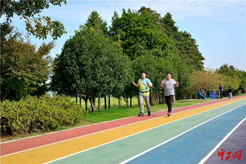 2020年10月25日,无锡市太湖湖畔贡湖湾五彩赛道上,跑步爱好者为迎接马拉松赛助跑。杨木军摄